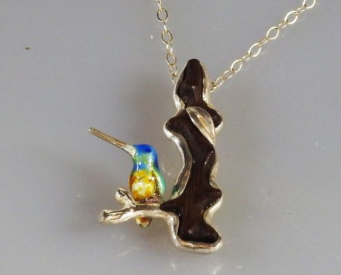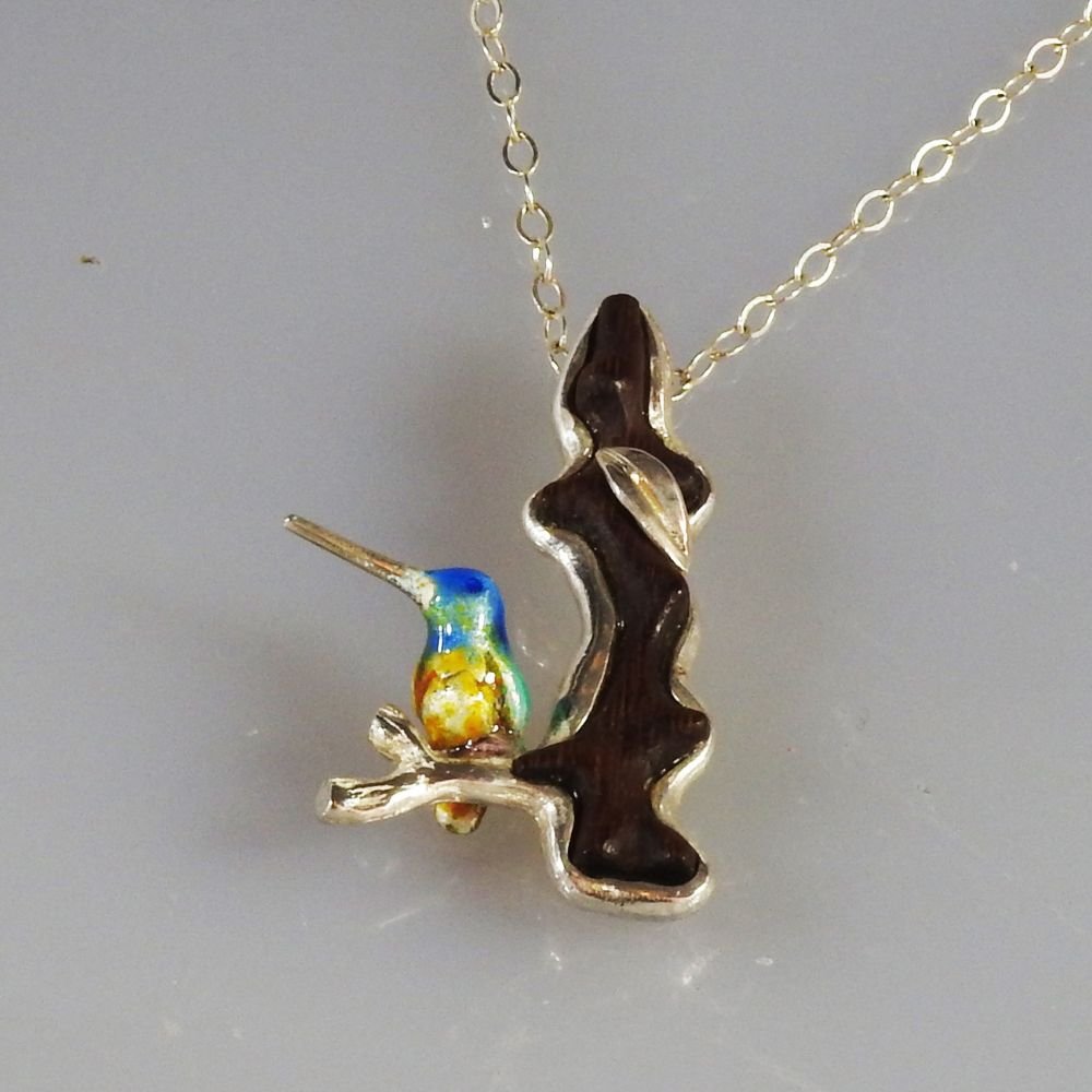 Este colgante vertical muestra a un colibrí esmaltado que se posa en una rama de ébano contenida en plata 9.50