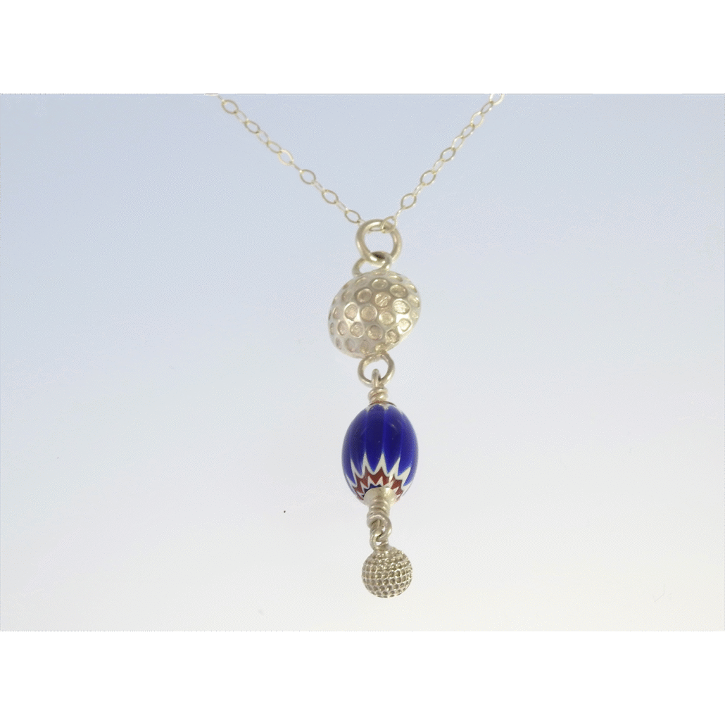 Collar modelo Matiné de 50 cm con media esfera en plata 9.25, acompañada con una llamativa pieza de cerámica azul, blanca y roja que culmina con una pequeña esfera. Todo en esta pieza expresa la elegancia de nuestro diseño MonPal.