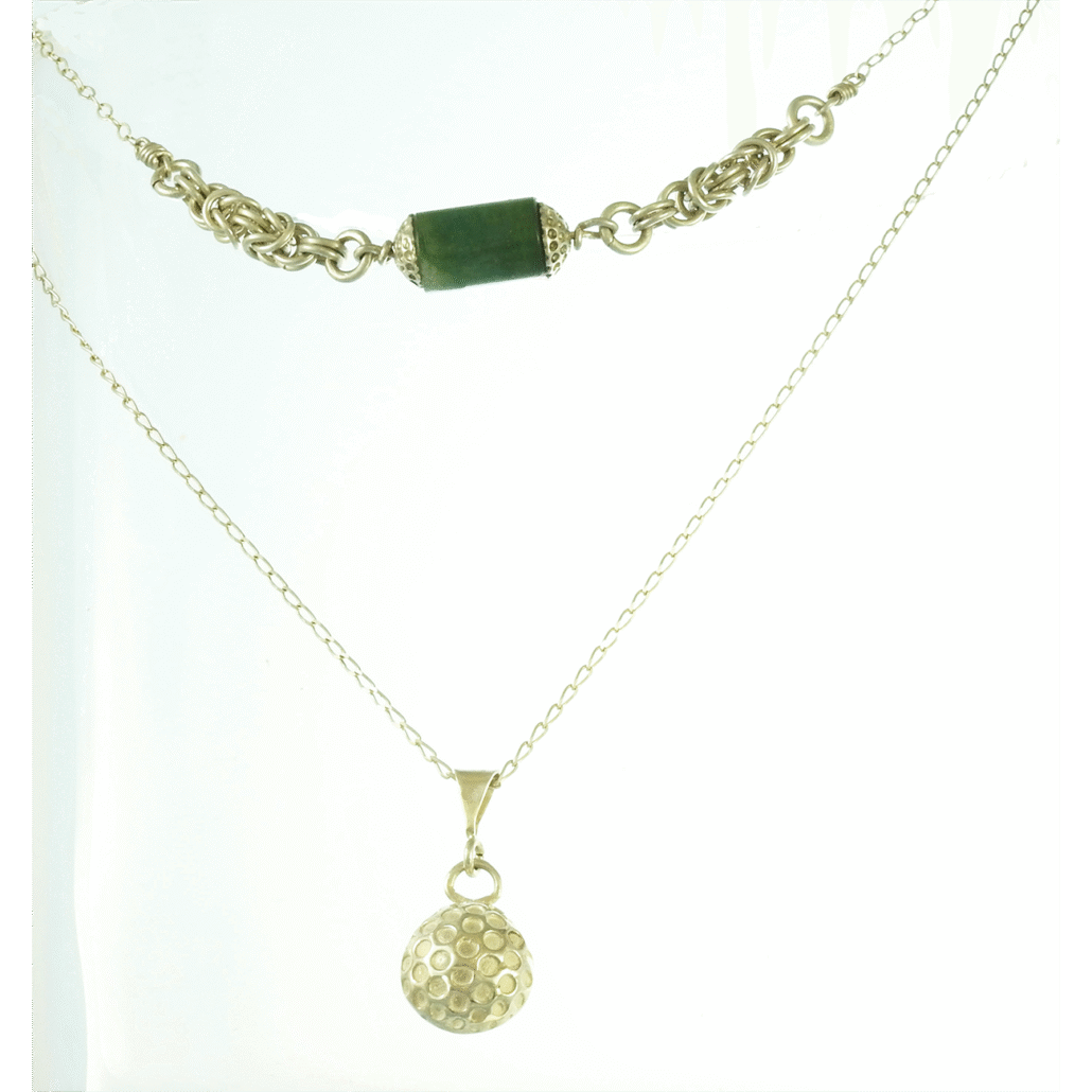 Collar doble en plata 9.25 con una gargantilla de 40 cm que lleva dos tiras de eslabones tipo vikingo con una pieza de jadeíta al centro. La cadena más larga es también de plata 9.25 modelo Matiné de 50 cm y culmina con media esfera. Todo el conjunto es una muestra de nuestro exclusivo diseño MonPal.