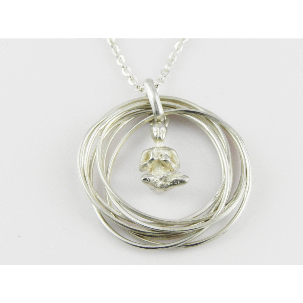 Collar en plata 9.25 que luce un colgante de siete aros, muestra un pequeño buda al centro y pende de una cadena modelo Princesa de 55 cm. Para el diseño de esta significativa pieza nos inspiramos en los siete aros de energía que rodean a los grandes maestros tradicionales de la cultura oriental.