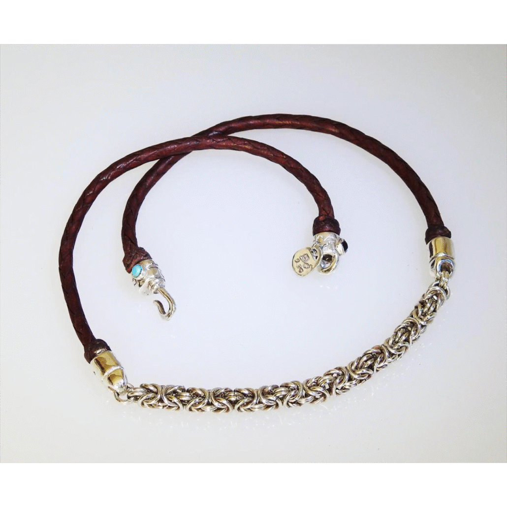 Collar modelo Capadocia elaborado en plata 9.25 y piel finamente trenzada en modelo Ópera de 45 cm con broche de diseño exclusivo MonPal adornado con una amatista y una turquesa. La palabra Capadocia tiene un origen persa que significa tierra de caballos hermosos. Se considera que la amatista proporciona coraje y fortalece las relaciones, en cuanto a la turquesa se la ha asociado con la buena suerte y la salud.