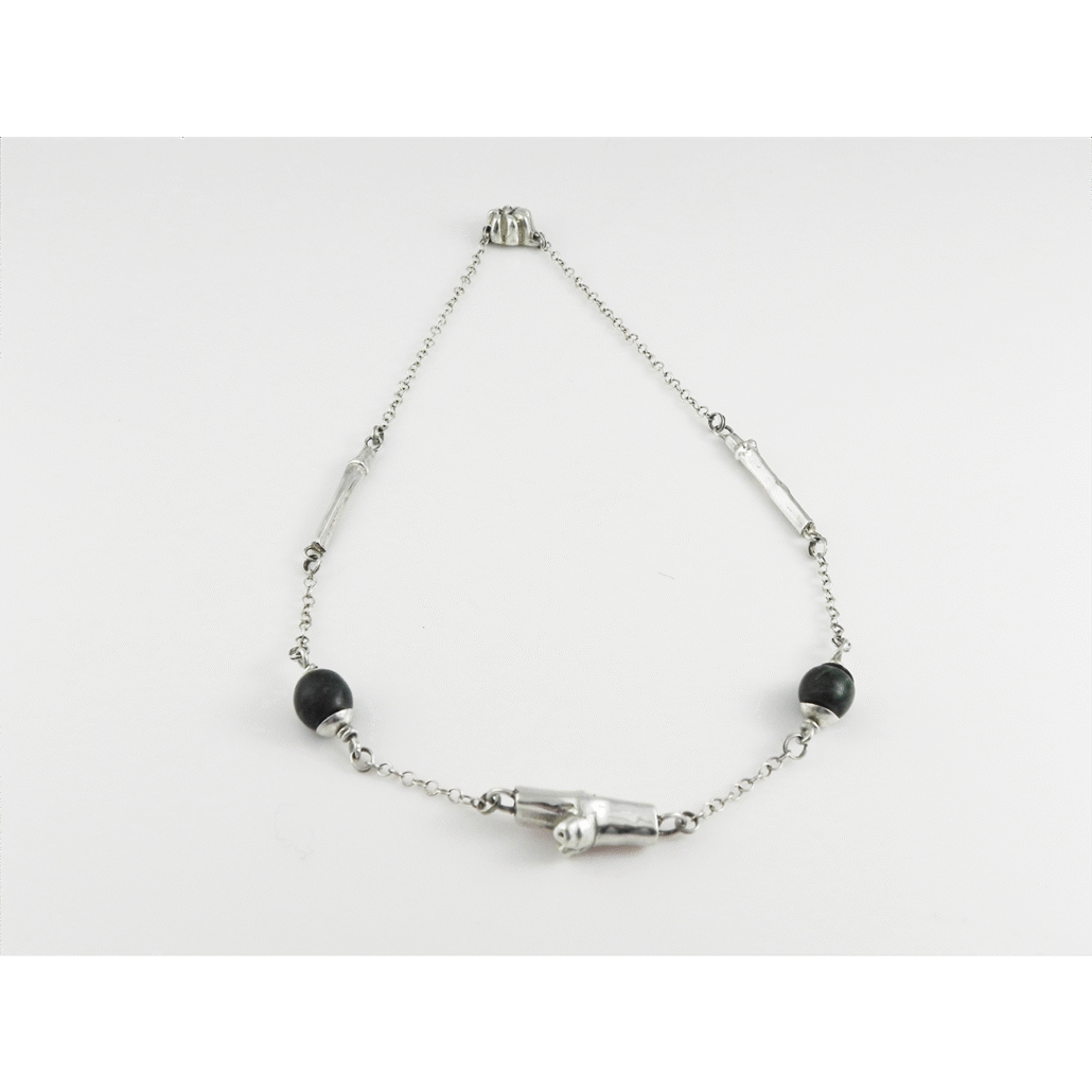 Collar modelo Princesa de 45 cm elaborado en plata 9.25 con una copia fiel de una rama de bambú al centro, dos delgadas ramas a los lados y dos jadeítas. Cuenta con un broche magnético en forma de Flor de diseño exclusivo MonPal. En nuestras culturas originarias como la maya y la mexica la jadeíta era estimada como una piedra sagrada muy valorada. Por su parte el bambú es considerado como un regalo de buena fortuna.