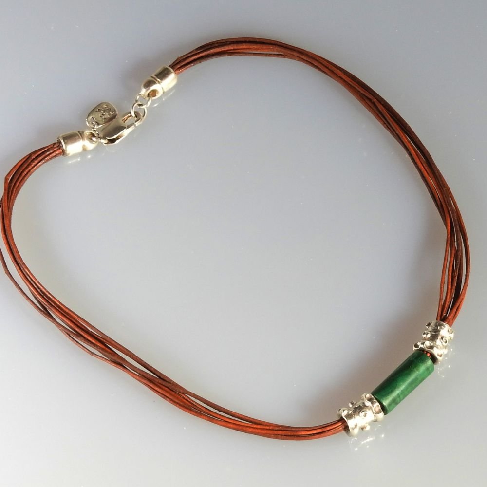 Collar de siete hilos delgados de piel, con una jadeíta verde y dos terminaciones de plata 9.25 al centro. El broche tambián está elaborado en plata.