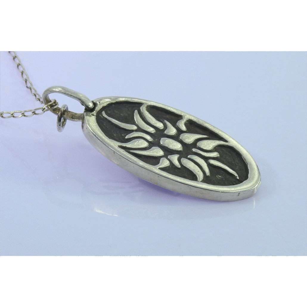 Collar Saludo al Sol en plata 9.25 con colgante de dos vistas: un sol con fondo negro al frente y las trece figuras del saludo al sol del yoga en la parte Trasera, lleva una cadena modelo Matiné de 65 cm. En la tradición del yoga este ejercicio está considerado como una reverencia al sol, a la energía vital y al conocimiento de uno mismo.