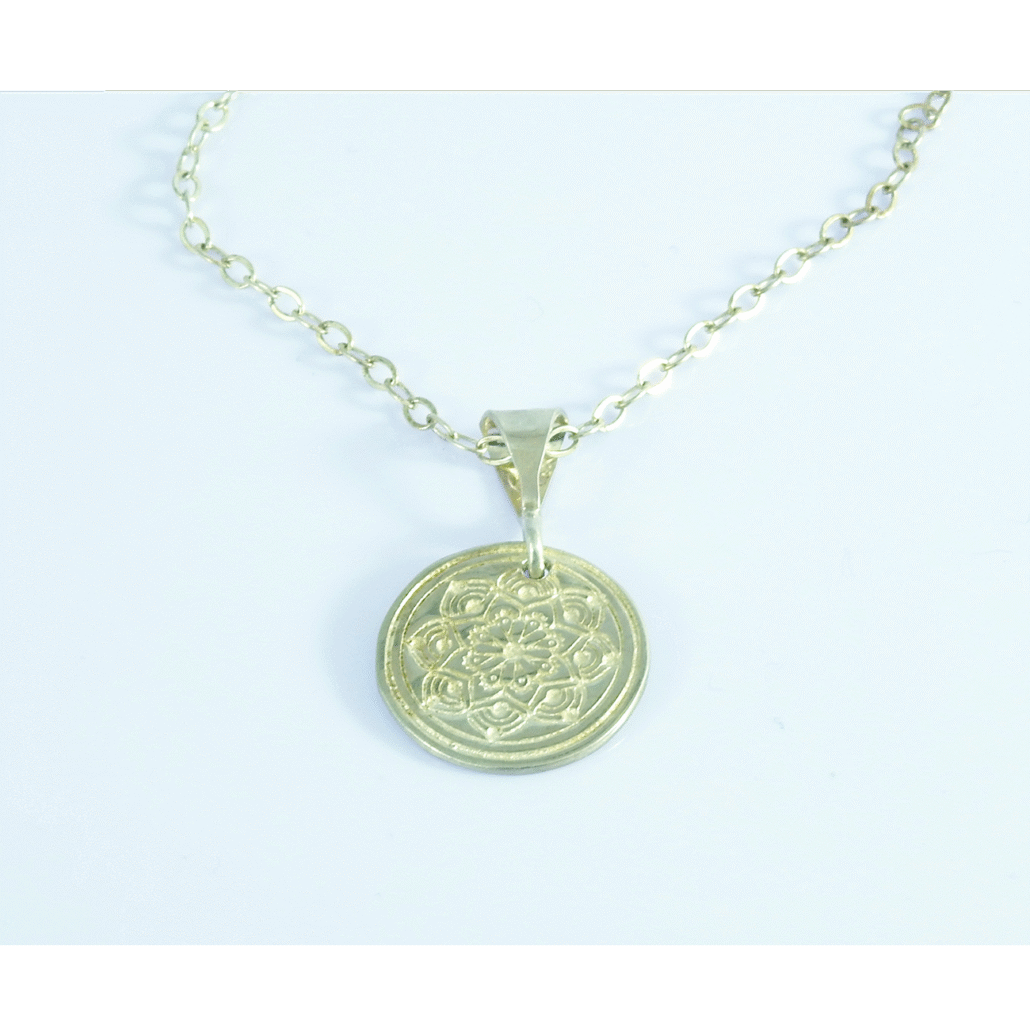 Dije Mandala de diseño especial MonPal con acabado en Oro Vermeil. Los mandalas tienen como forma fundamental al círculo que representa la totalidad, el ciclo de la vida y la perfección.