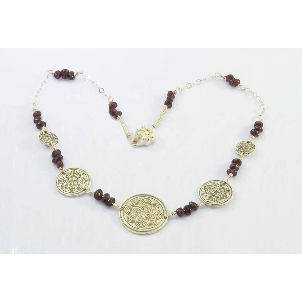 Este collar nos transmite alegría y el gusto de vivir. Su diseño lleva un mandala grande al centro, acompañado por otros dos mandales medianos y dos pequeños más 30 granates intercalados, su broche es magnético en forma de Flor de diseño exclusivo MonPal.