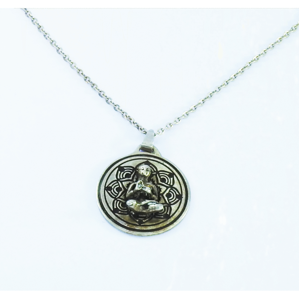 Este colgante de diseño exclusivo MonPal nos muestra un mandala con un Buda al centro. Su cadena modelo Princesa es de 40 cm. La pieza está elaborada en plata 9.25.