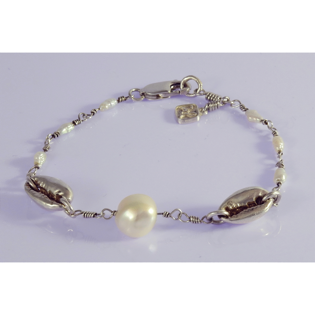Pulsera con dos caracolas de plata 9.25, lleva una perla barroca al centro de una cadena que engarza con seis pequeñas perlas de río. Las perlas blancas simbolizan pureza y nuevos comienzos. Por su parte las caracolas representan la tranquilidad y la protección.