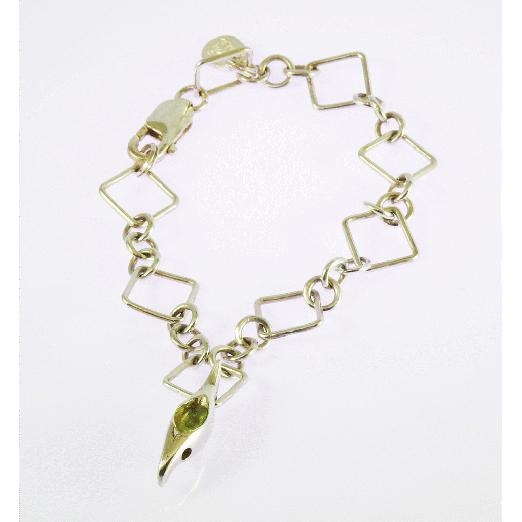 Pulsera en plata 9.25 formada por eslabones cuadrados y un colgante en forma de Zig Zag con un peridoto al centro. Se considera que el peridoto lleva en sí el color de la naturaleza y que es revitalizante