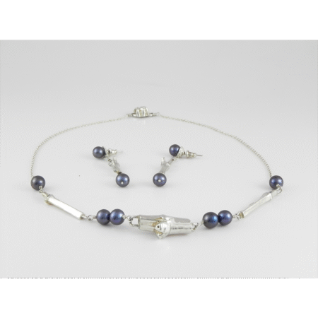 Juego de collar y aretes en plata 9.25 con perlas negras cultivadas y broche magnético en forma de Flor de diseño exclusivo MonPal. Aretes largos (4 cm). Collar modelo Princesa (45 cm). Su diseño evoca motivos de fuerza representados por los bambúes. Las perlas negras significan misterio y singularidad. En la cultura china se regalan para desear buena suerte y fortuna.