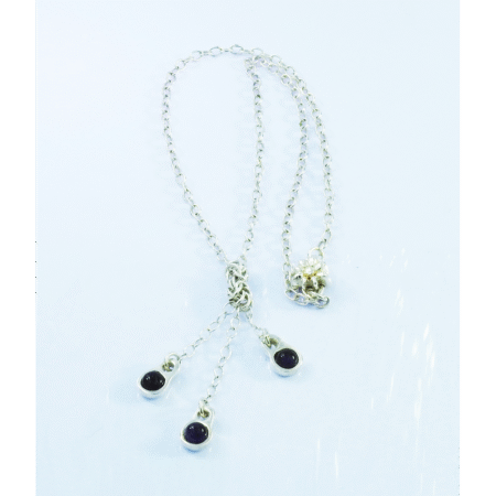 Exquisito collar elaborado en plata 9.25 que culmina con tres lágrimas de amatista unidas con tejido vikingo, su cadena fue completamente hecha a mano en modelo Matiné de 54 cm que cierra con nuestro broche magnético Flor, de diseño exclusivo MonPal. En esta pieza se plasma el amor y el cuidado en el trabajo que caracteriza al espíritu con el que laboramos en MonPal.