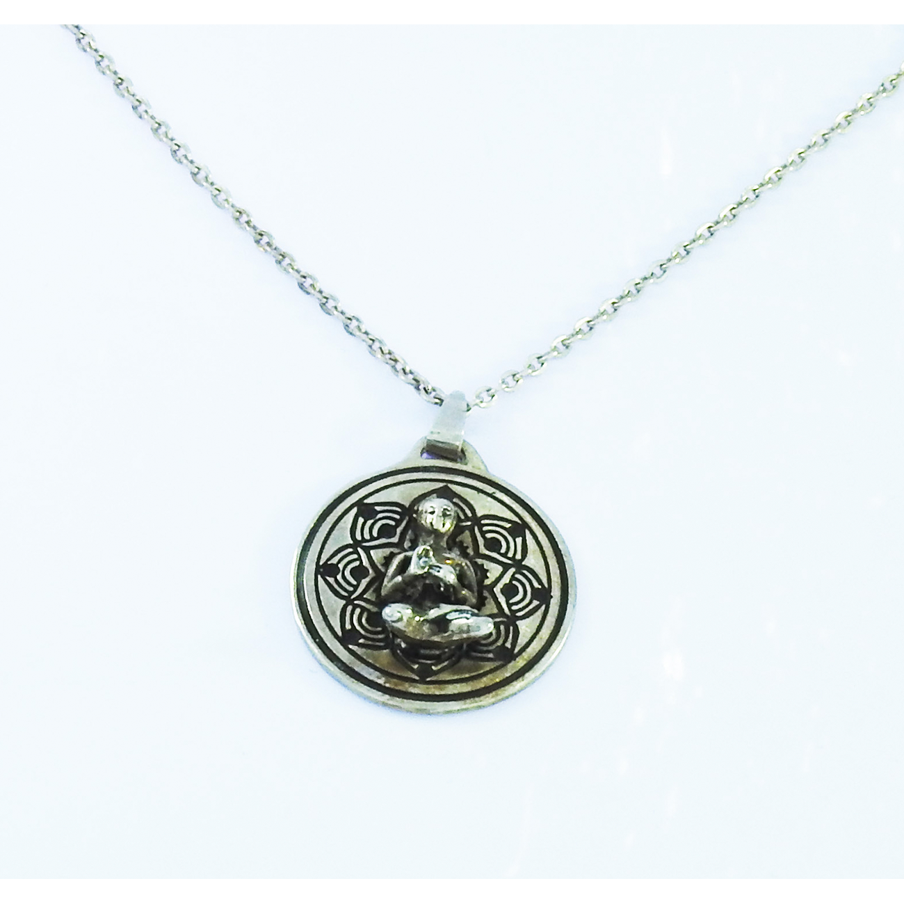Este colgante de diseño exclusivo MonPal nos muestra un mandala con un Buda al centro. Su cadena modelo Princesa es de 40 cm. La pieza está elaborada en plata 9.25.