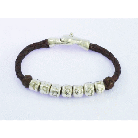 Pulsera que muestra los siete Chakras grabados en plata 9.25 a los que sostienen dos tropiezos de nudos turcos seguidos de una cadena de piel de cabra finamente tratada y trenzada en cuatro tientos que cierra con un broche magnético de plata 9.25 de diseño exclusivo MonPal. De acuerdo con los libros sagrados del hinduismo, los Chakras representan la armonía de los siete centros de energía situados en el cuerpo humano.