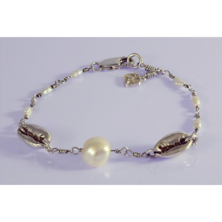 Pulsera con dos caracolas de plata 9.25, lleva una perla barroca al centro de una cadena que engarza con seis pequeñas perlas de río. Las perlas blancas simbolizan pureza y nuevos comienzos. Por su parte las caracolas representan la tranquilidad y la protección.