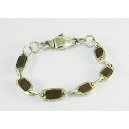 Pulsera formada por eslabones elaborados en plata 9.25 y en ébano. Un broche de diseño exclusivo MonPal cierra la pulsera. Su diseño forma una cadena de luz y sombra. La madera de ébano se relaciona con la fuerza y la elegancia.