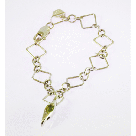 Pulsera en plata 9.25 formada por eslabones cuadrados y un colgante en forma de Zig Zag con un peridoto al centro. Se considera que el peridoto lleva en sí el color de la naturaleza y que es revitalizante