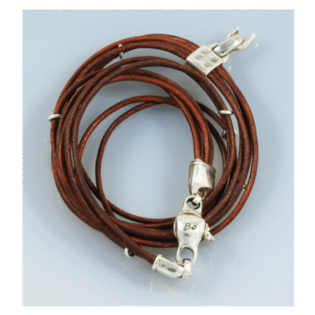 Pulsera larga de tres vueltas, elaborada con piel y plata 9.25. Está formada por hilos delgados de fina piel de 57 cm de longitud total. Cuenta con broche magnético de diseño exclusivo de la línea Bò de MonPal. Esta pieza está inspirada en la ruptura de una relación tóxica que en su eslabón roto simboliza la libertad para seguir adelante.