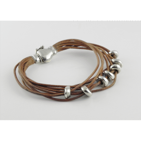 Pulsera modelo Siete Días formada por siete tientos de fina piel con tropiezos en plata 9.25 y broche magnético de diseño exclusivo MonPal. La magia de cada uno de los siete días de la semana corre libremente y juega con los demás. ¡Así son los días!